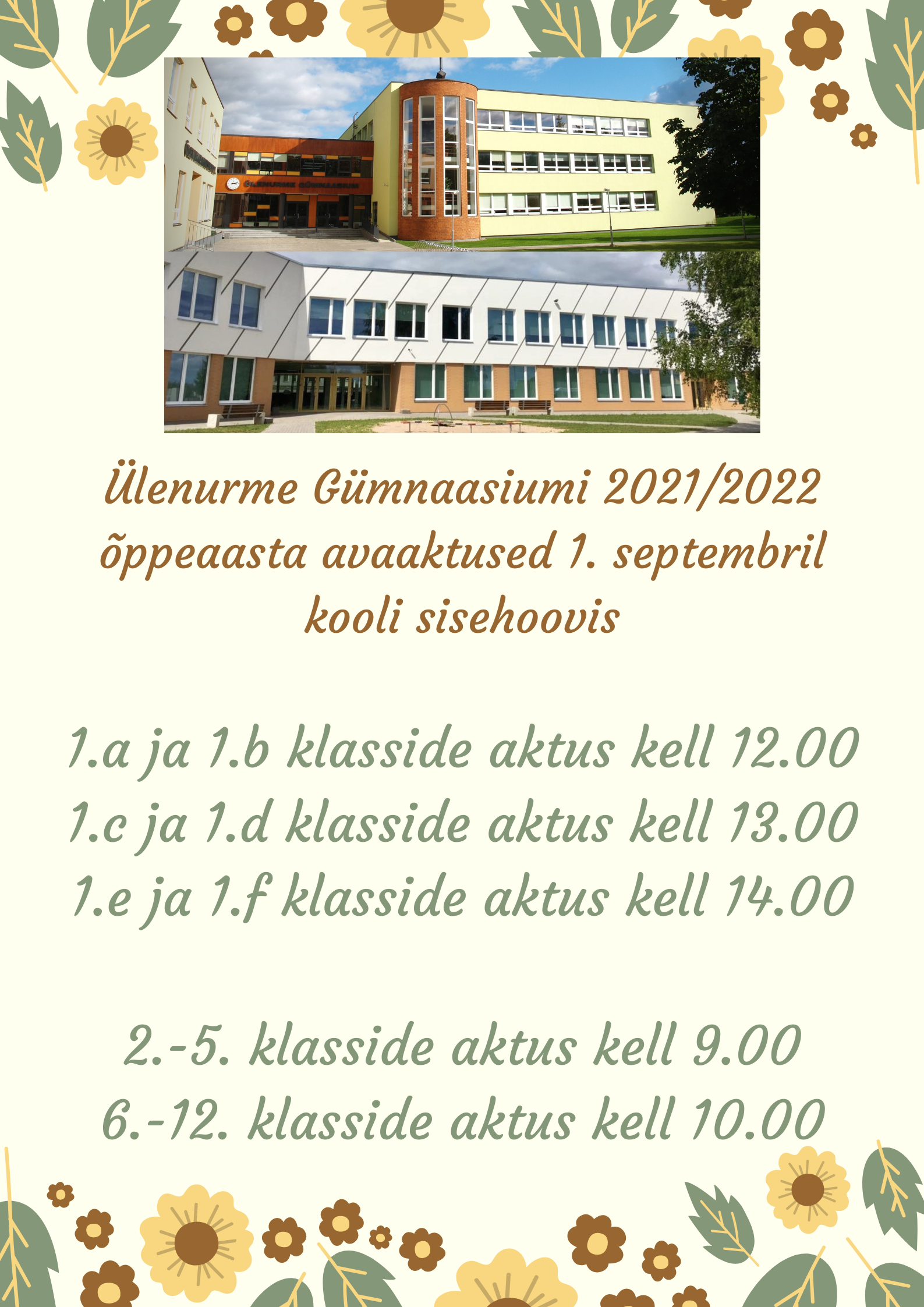 Palume lapsevanematel tulla 1. klasside aktusele covid-19 vastu vaktsineeritult või negatiivse testitulemusega, et vähendada viiruse leviku tõenäosust. Kõik haigustunnustega inimesed peavad jääma koju.