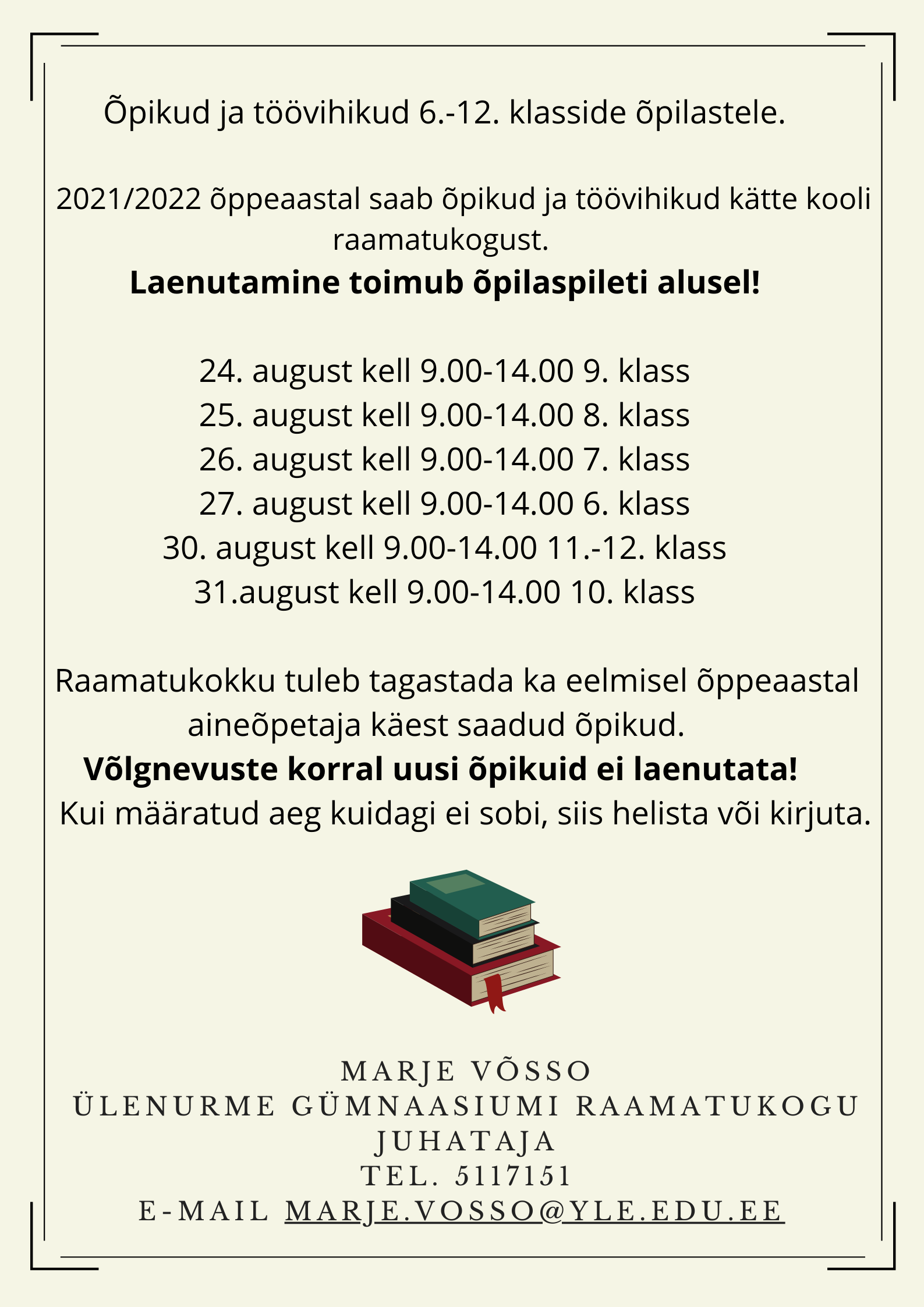 Info uue õppeaasta õpikute ja töövihikute kättesaamise kohta