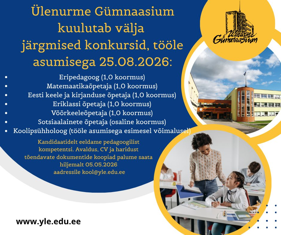 Tule loo koos meiega inspireerivat õpikeskkonda! Ülenurme Gümnaasium otsib oma kollektiivi uusi tegusaid ja hoolivaid õpetajaid.